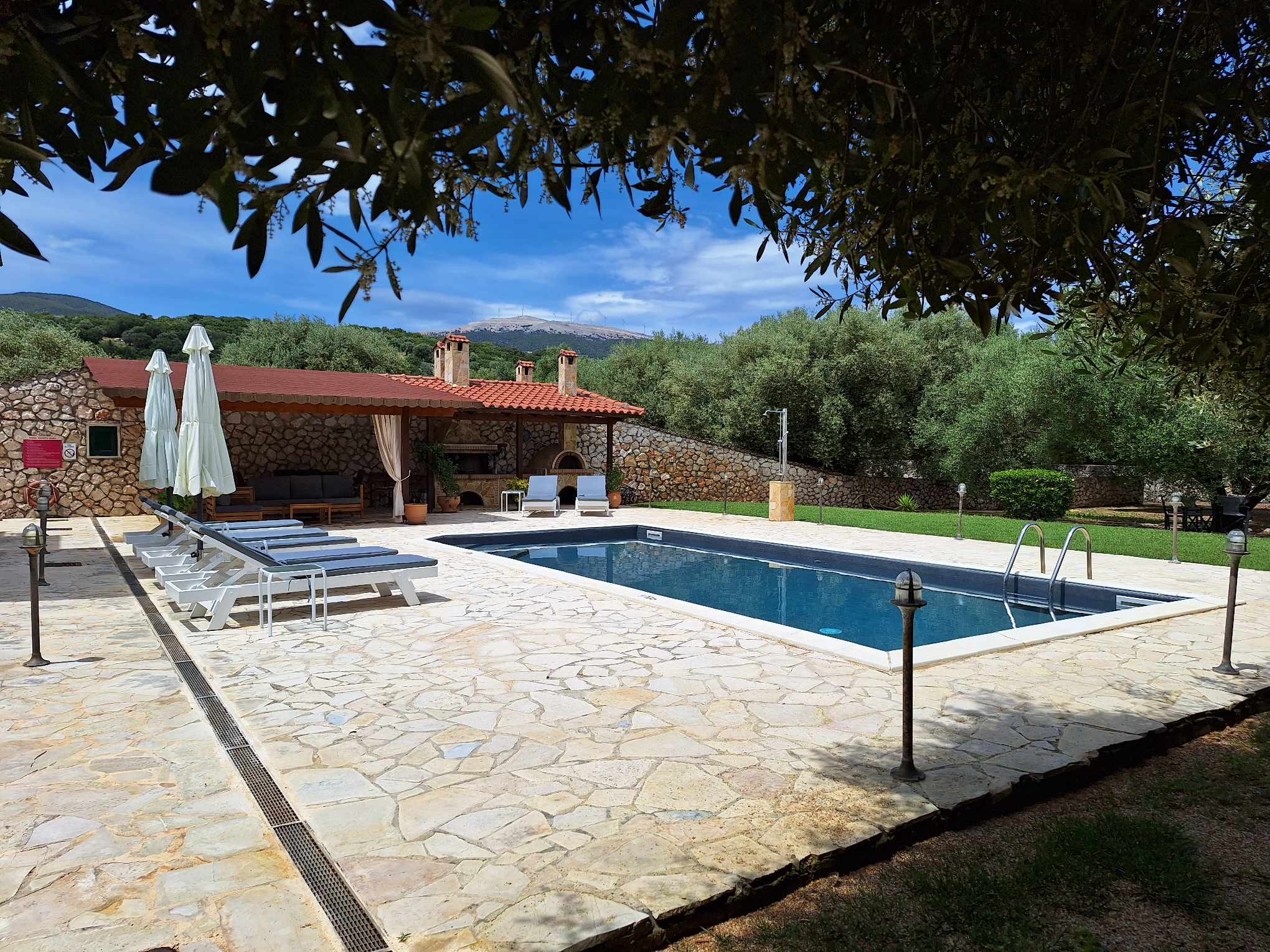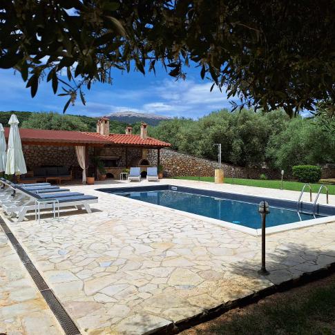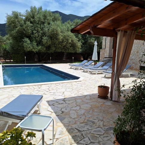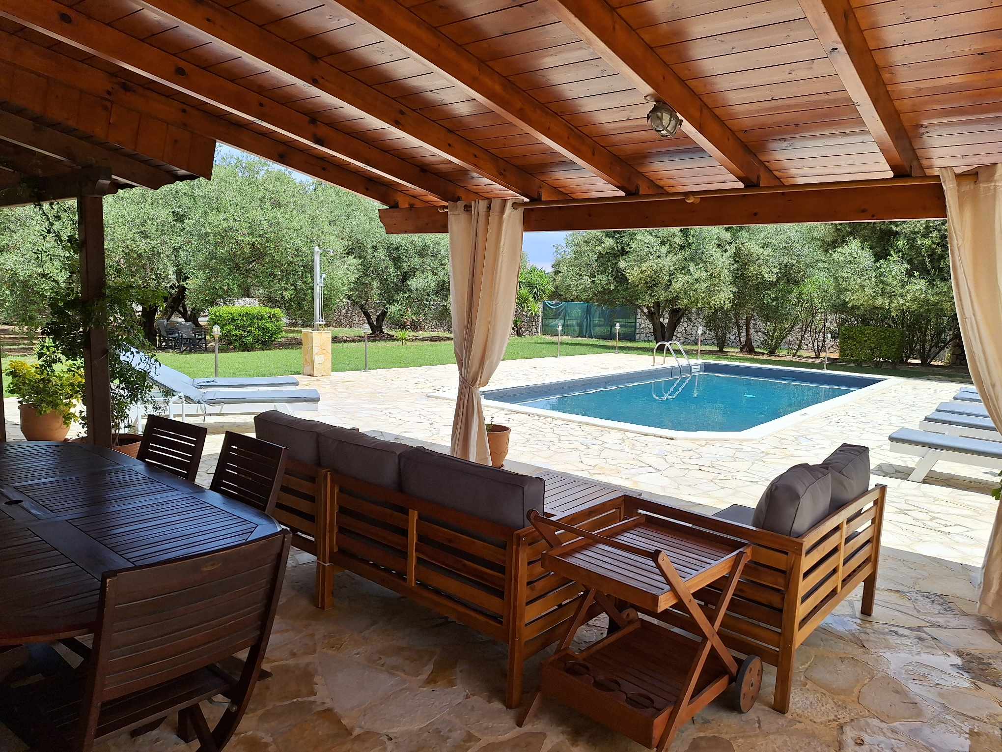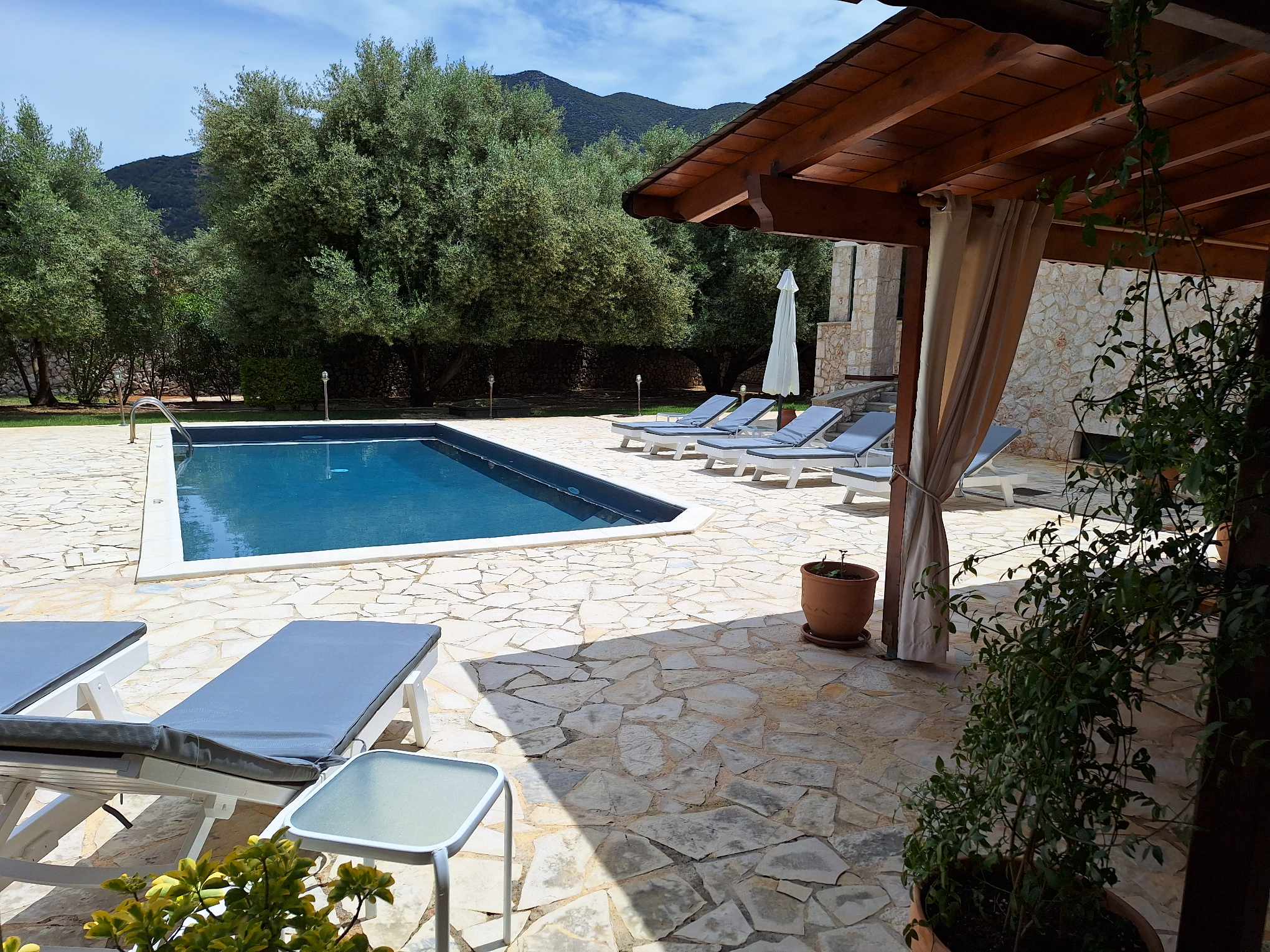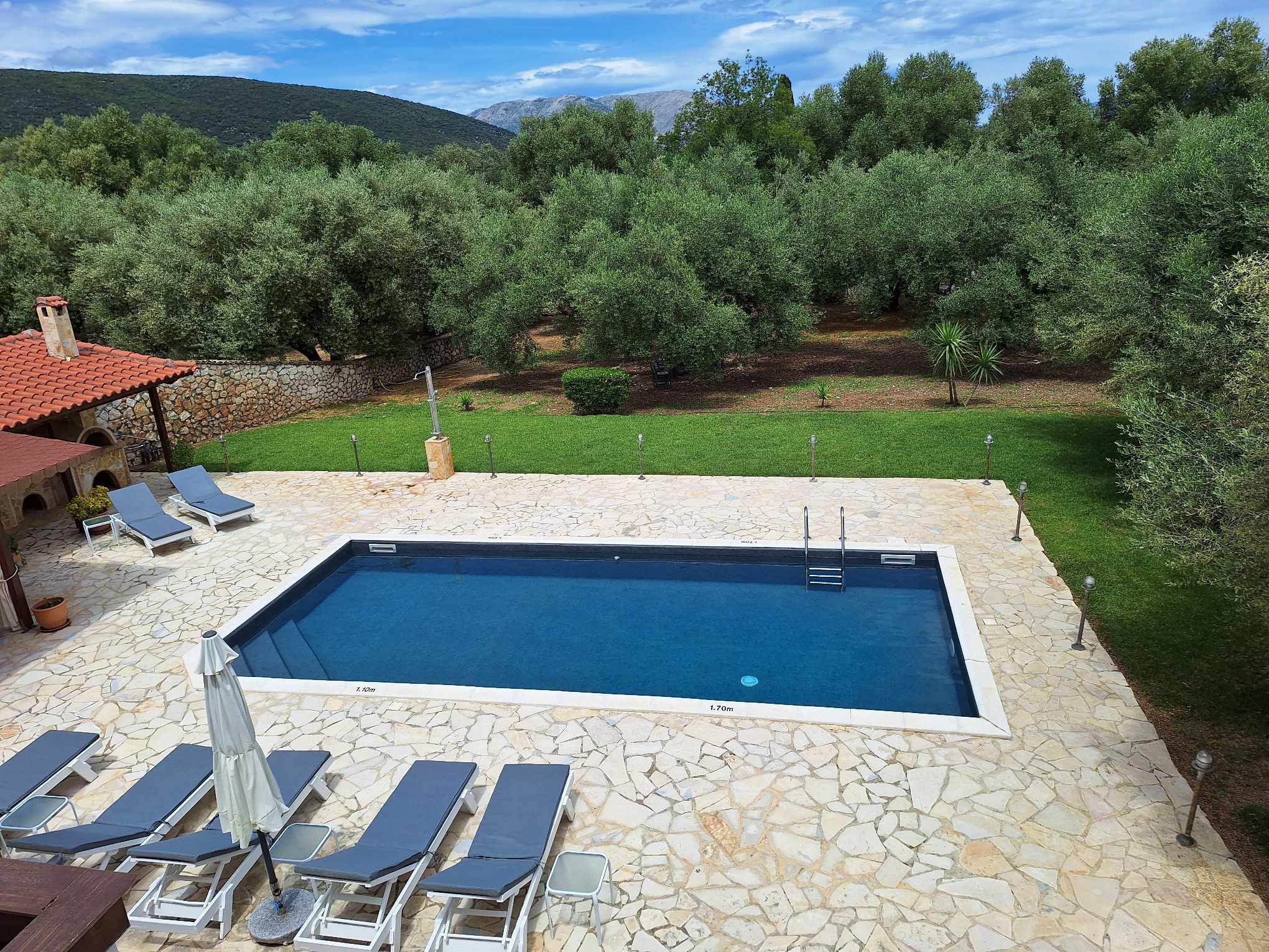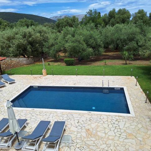 Outdoors: Private SALT WATER outdoor ροοl 9mx4m, Sunbeds and umbrellas, large lawned terrace area