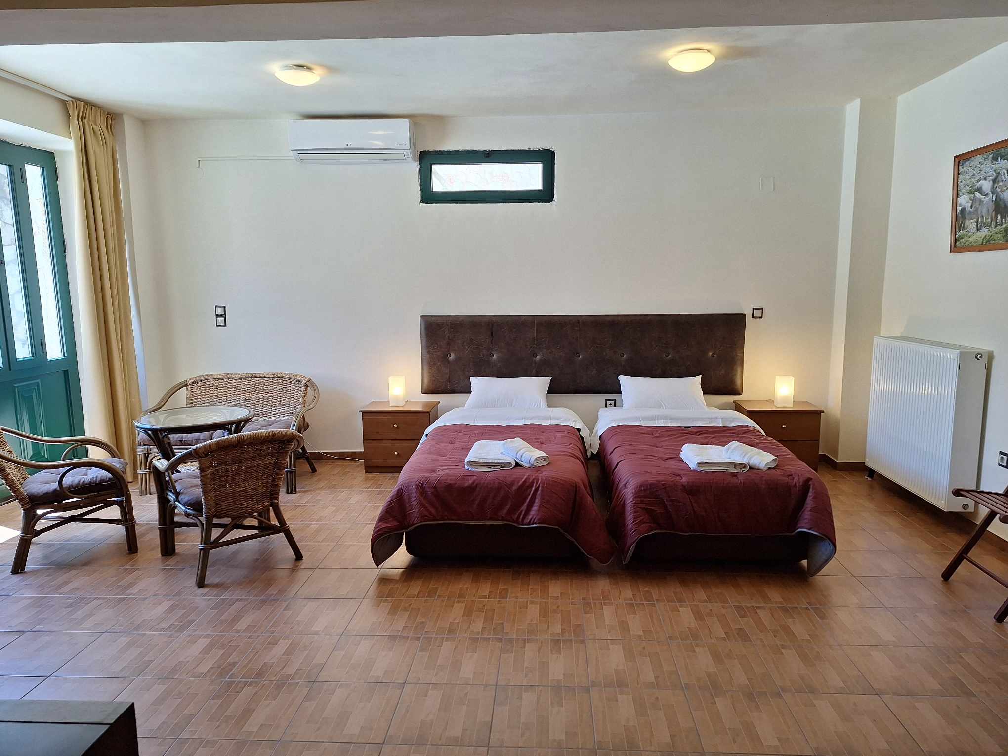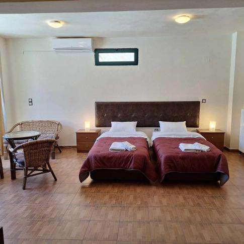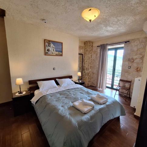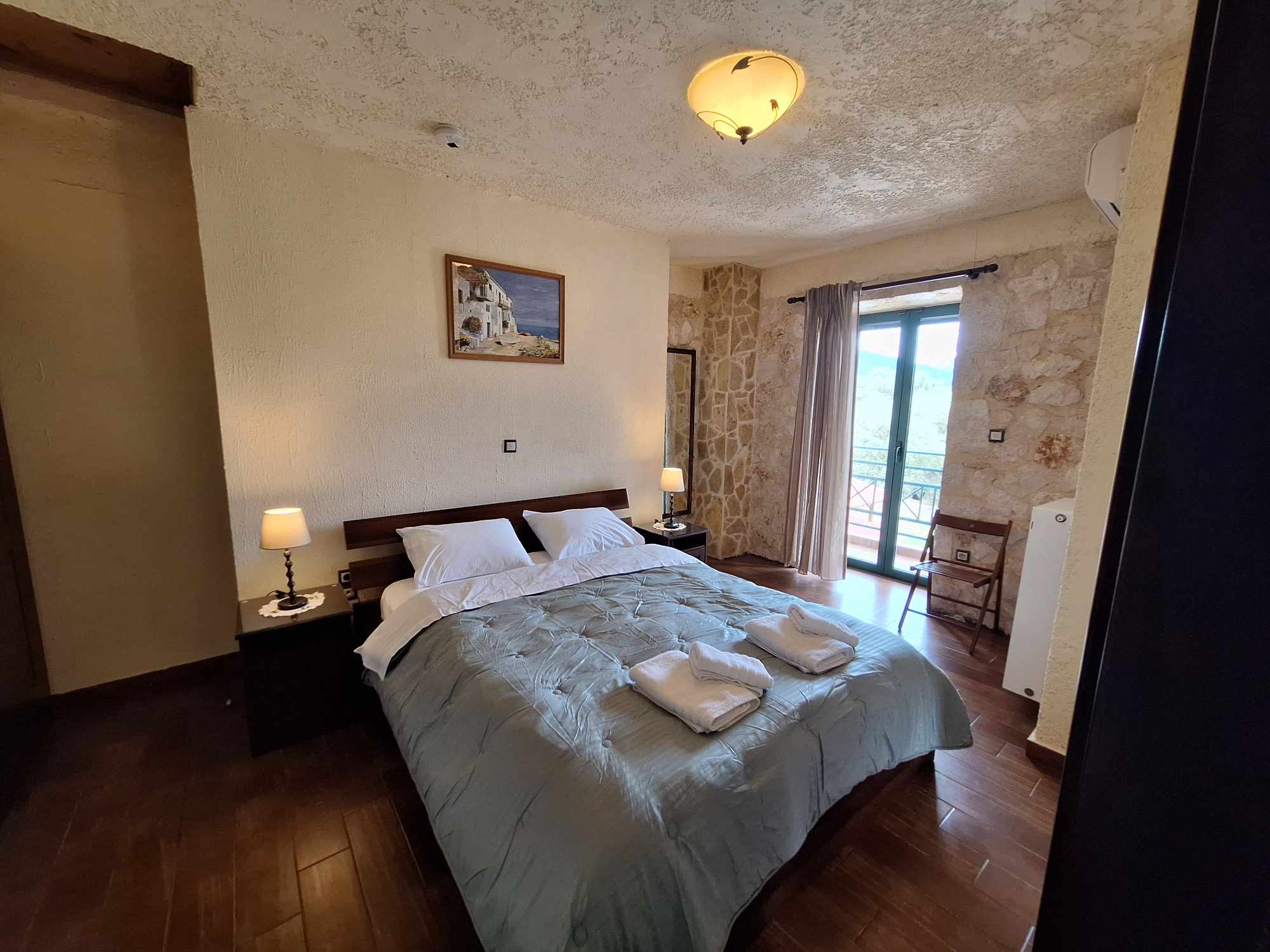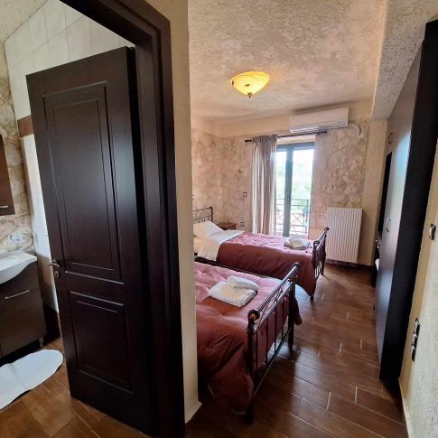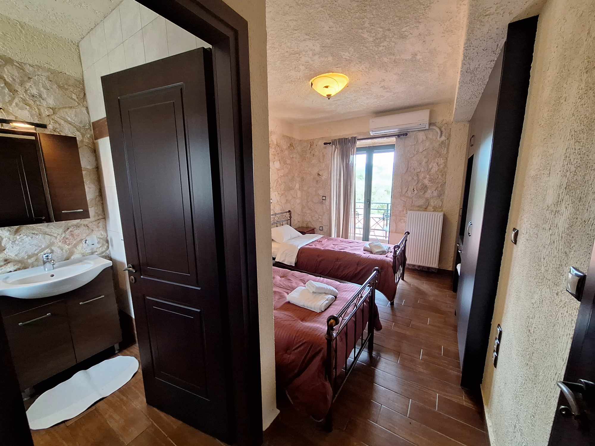 Upstairs you will find two bedrooms, one double and one twin bedded with ensuite bathrooms. Balconies leading off the bedroom overlook the ροοl area and have views to the mountains.