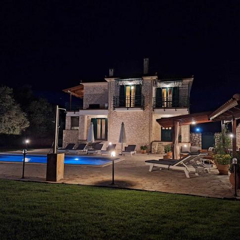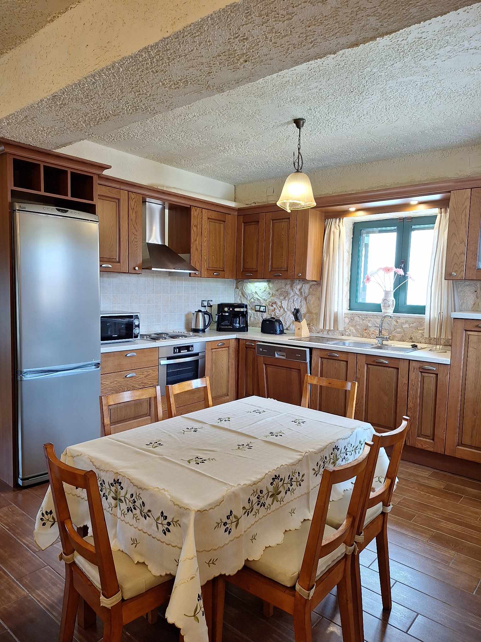Lίving room-kitchen, 3 bedrooms, 3 bathrooms of which 2 en suites and 1 shower room. Villa Stathis is a three storey villa. The modern lounge area on the upper ground level is open plan and very spacious with flat screen τν and homecinema, leather sofas and fully equipped kitchen. There is also a full bathroom with a washing machine. French doors lead out onto the terrace area and the ροοΙ